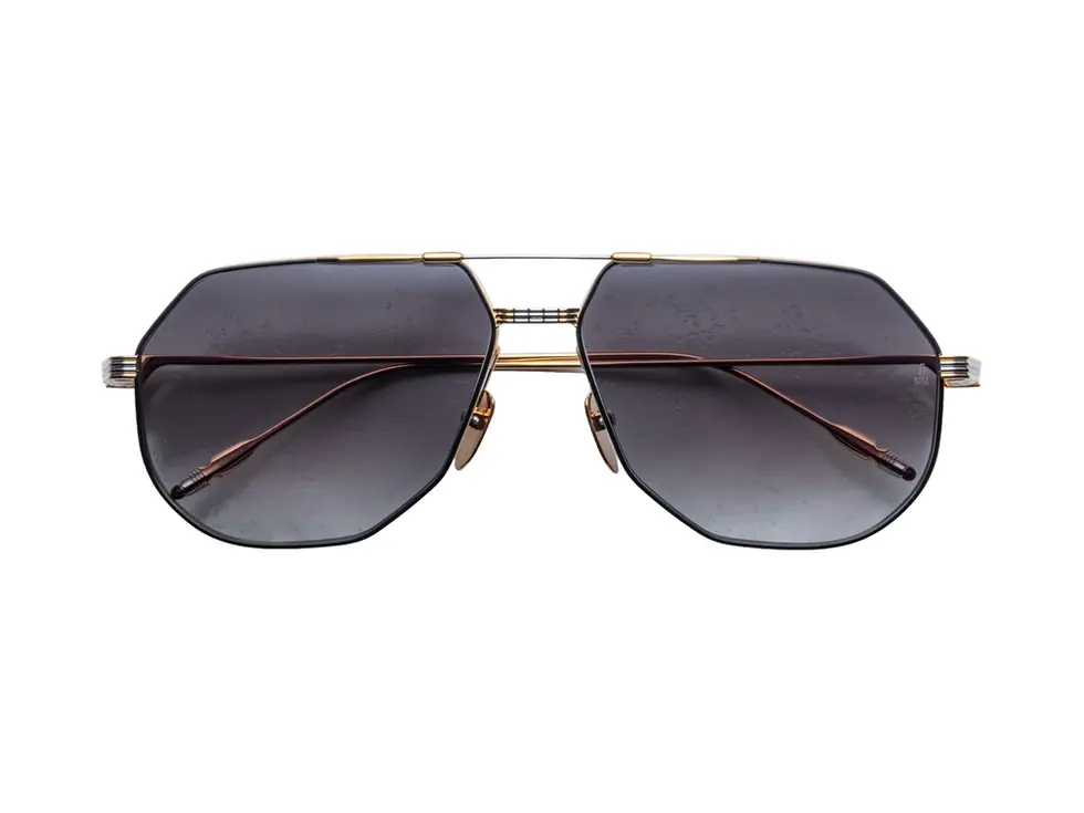An oversized, '70s-inspired titanium aviator with finely engraved double nose-bridge and signature tailfin temple tips.